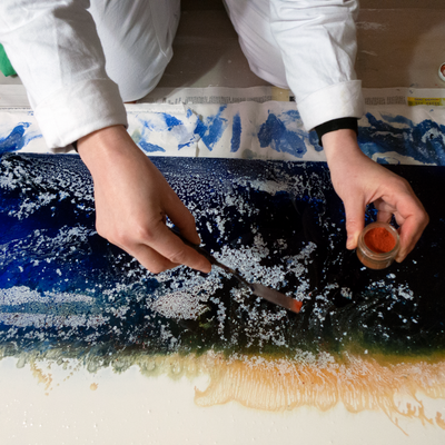 A l’âge de 2 ans j’ai découvert les feutres, ça a été une révélation. Ils ne m’ont plus quitté! Depuis, la palette d’outils c’est juste considérablement agrandie! Je suis devenue Designer Textile & Graphiste avec toujours une pratique picturale parallèle. Puis, un grave accident sportif me met KO plusieurs mois. Il fait office d’électrochoc. C’est, allongée dans mon lit que je décide de devenir artiste professionnelle. A ce moment là, j’ignore combien de temps va prendre la reconstruction de toutes mes connections vitales, celles qui me maintiennent debout et me permettent l’usage parfaitement coordonné de mes 4 membres. L’art, l’acte de peindre m’a aidé à me reconstruire et l’accident, à me mettre en marche vers mes rêves.