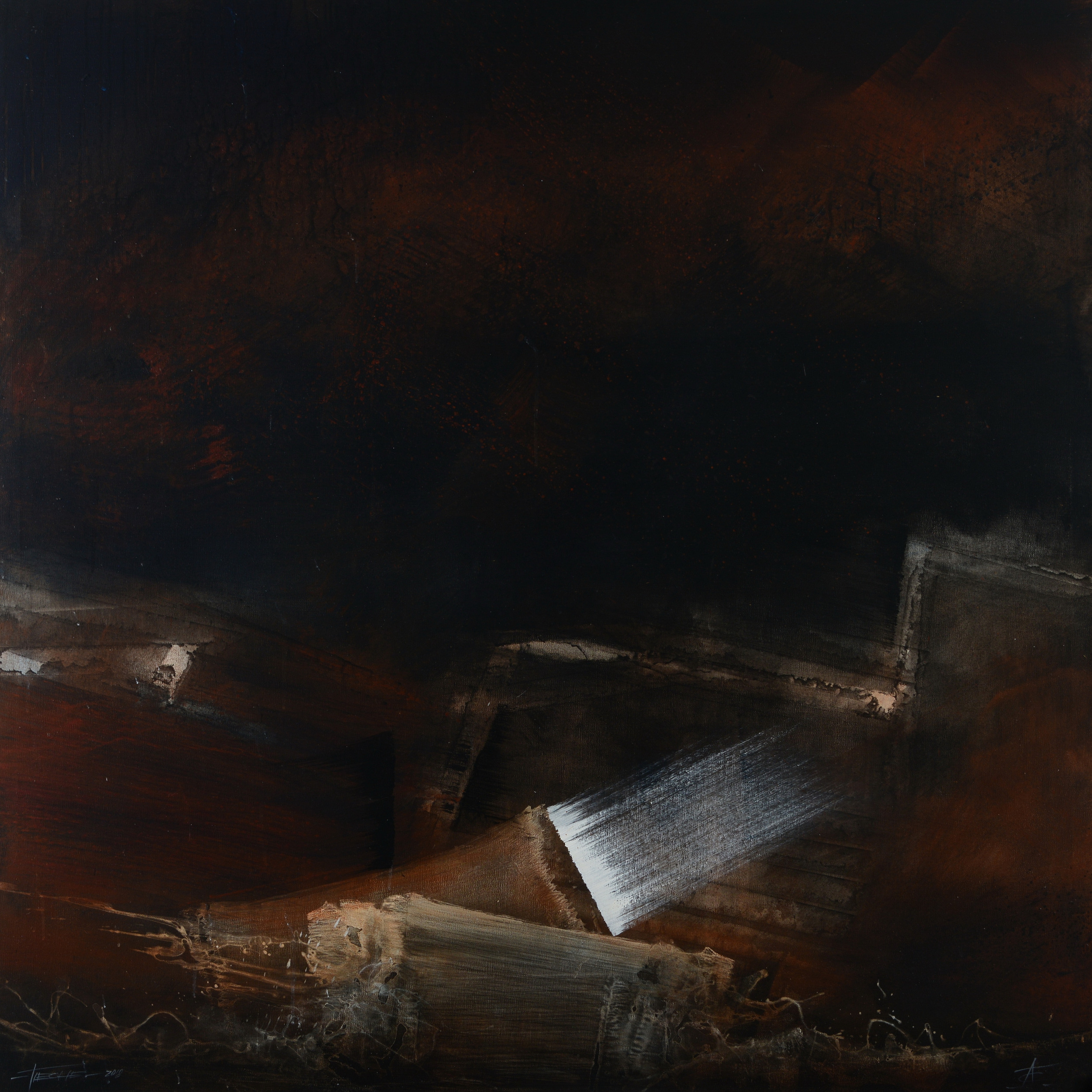 Les peintures de Claude Tièche racontent une histoire, un peu la sienne, un peu la nôtre. L'artiste par le biais de ses oeuvres , donne une direction et ensuite, “chacun y met ce qu'il veut, choisit son sentier”. Claude Tièche ne souhaite pas donner une explication et une interprétation trop précise de l'histoire qui sous-tend ses créations. Il estime qu'elles reflètent suffisamment “ses tripes”. Il ne donne que le titre général des ses oeuvres, sans le sous-titre qui donnent une orientation trop claire, afin de favoriser le dialogue intérieur du spectateur. Texte Jocelyne Laurent