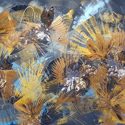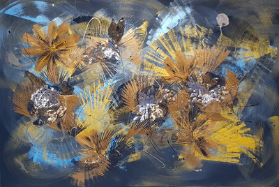 • Technique mixte, acrylique, Encre de Chine et collage plumes et broderie