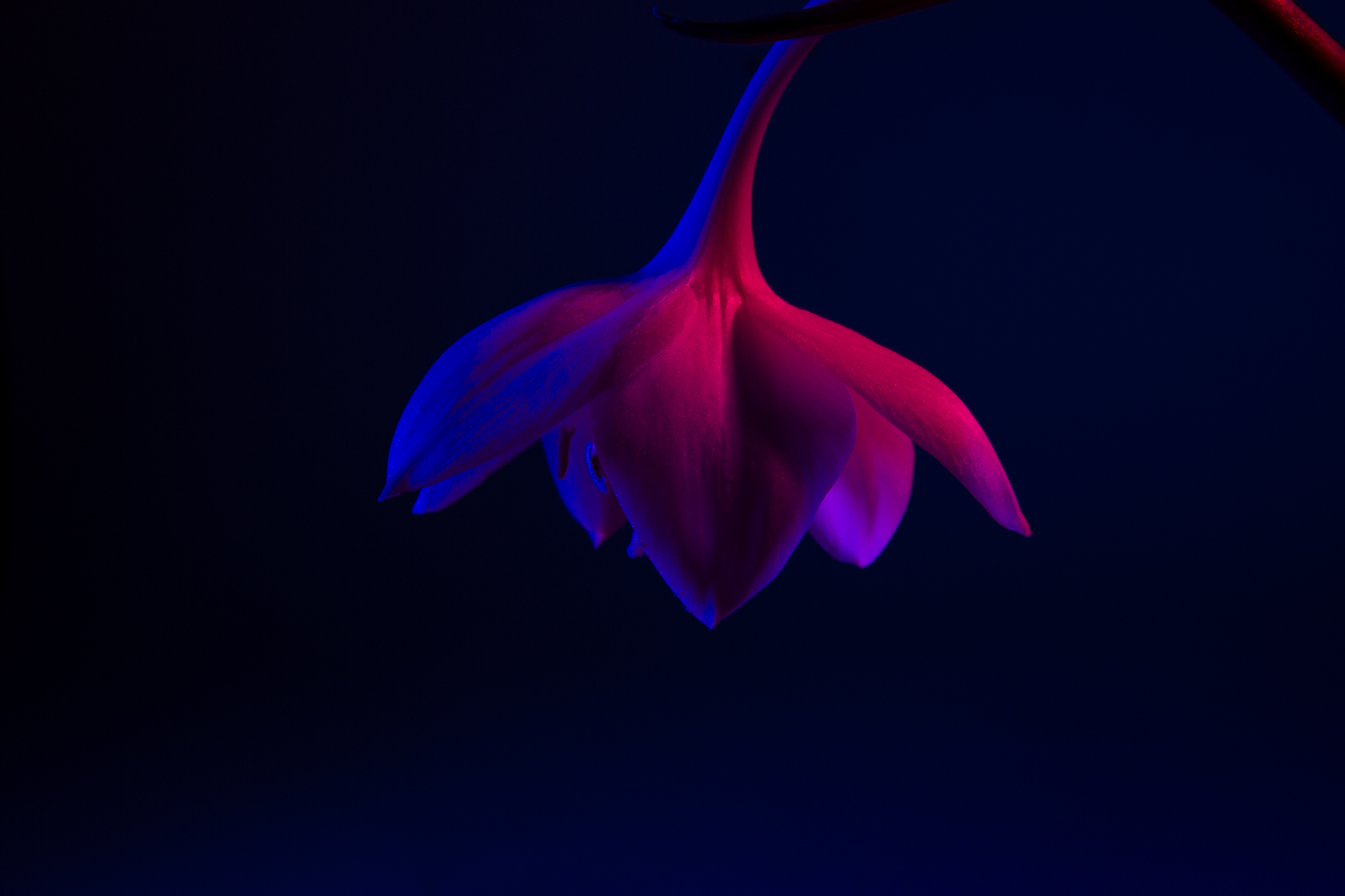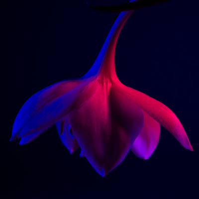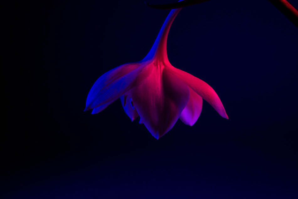 Série de photos prises en studio, composition avec des sources de couleurs teintées de magenta et de bleu profond, pour amener un contraste de couleurs.