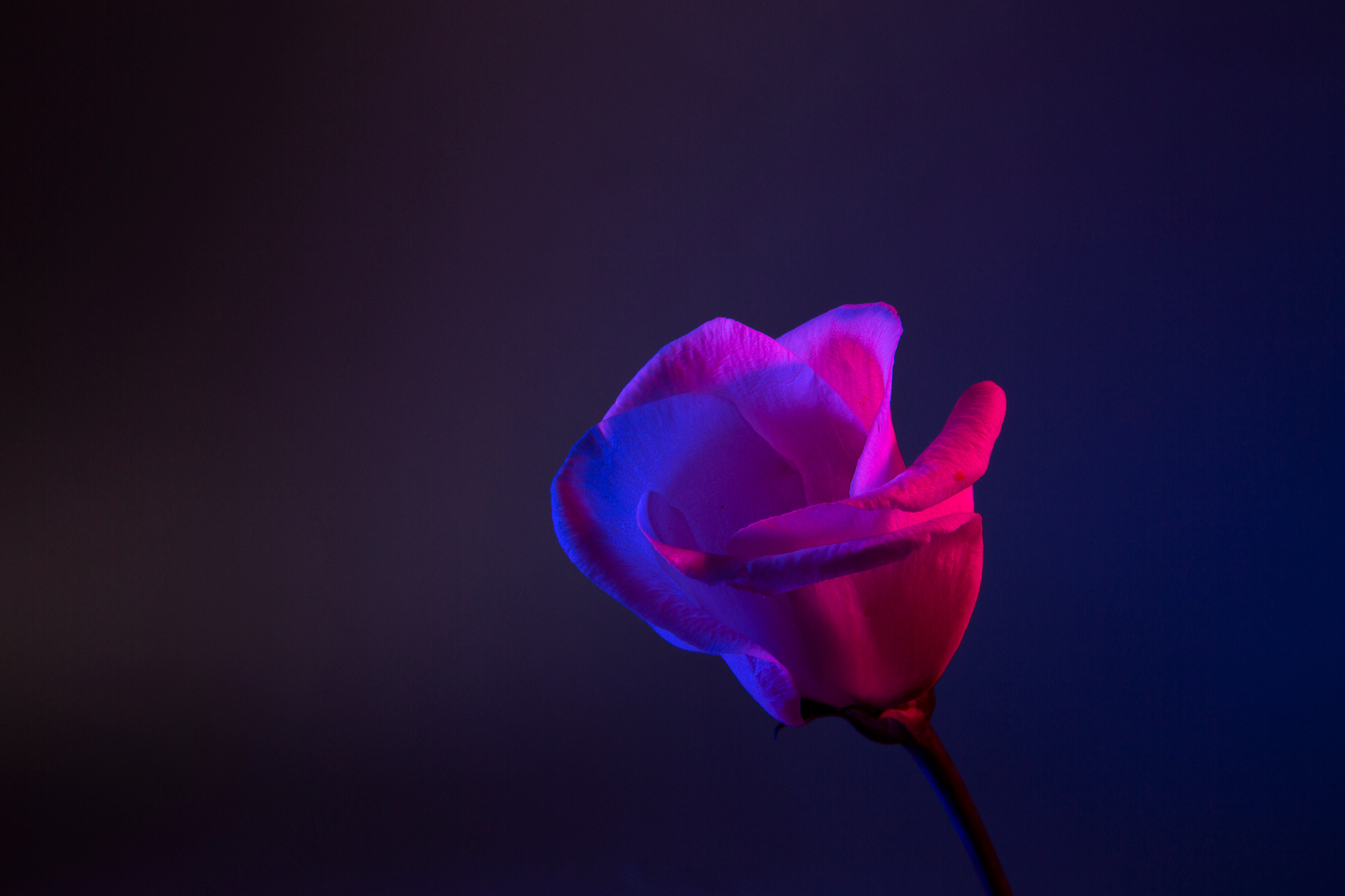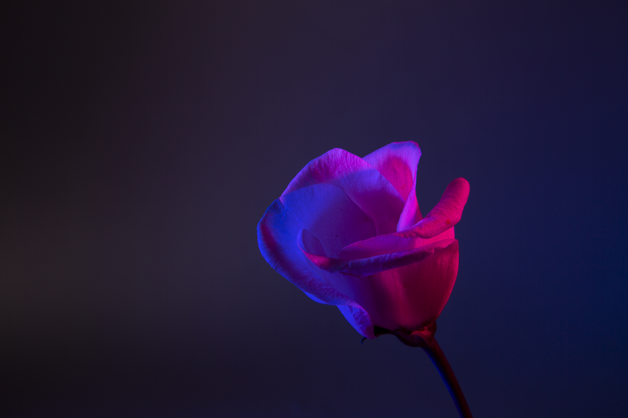Série de photos prises en studio, composition avec des sources de couleurs teintées de magenta et de bleu profond, pour amener un contraste de couleurs.