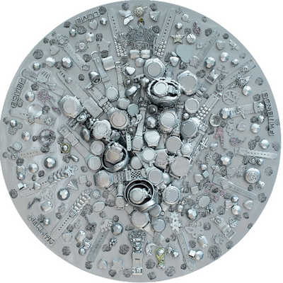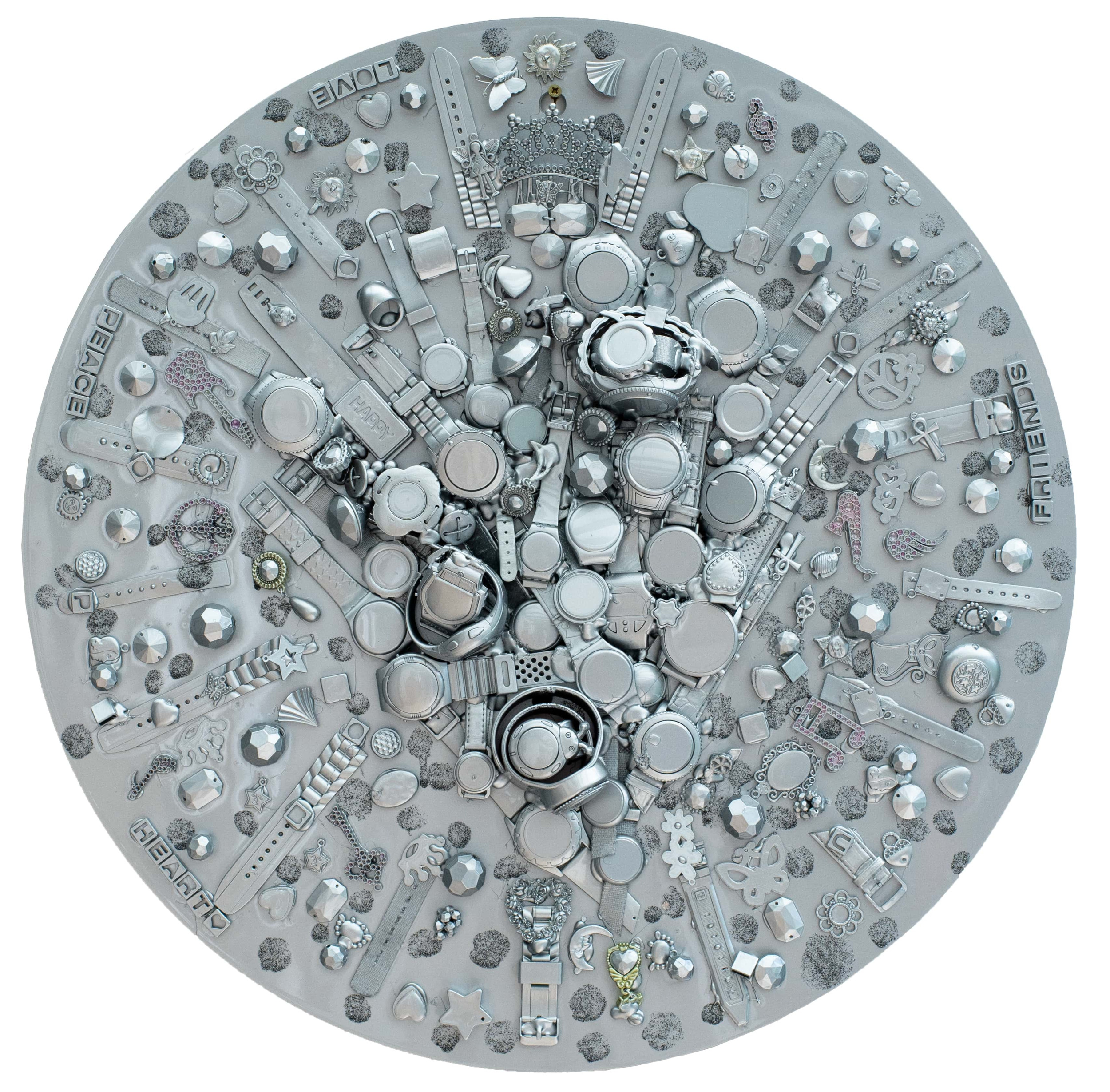 Objets collés sur une plaque en métal ronde d'un diamètre de 60cm. A accrocher comme un tableau ou poser à plat selon le choix.