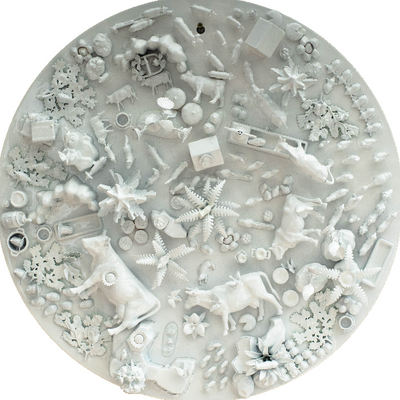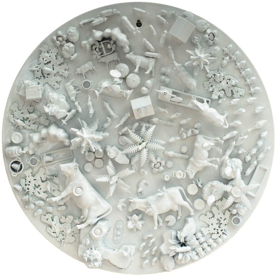 Objets collés sur une plaque en métal ronde d'un diamètre de 60cm. A accrocher comme un tableau ou poser à plat selon le choix.