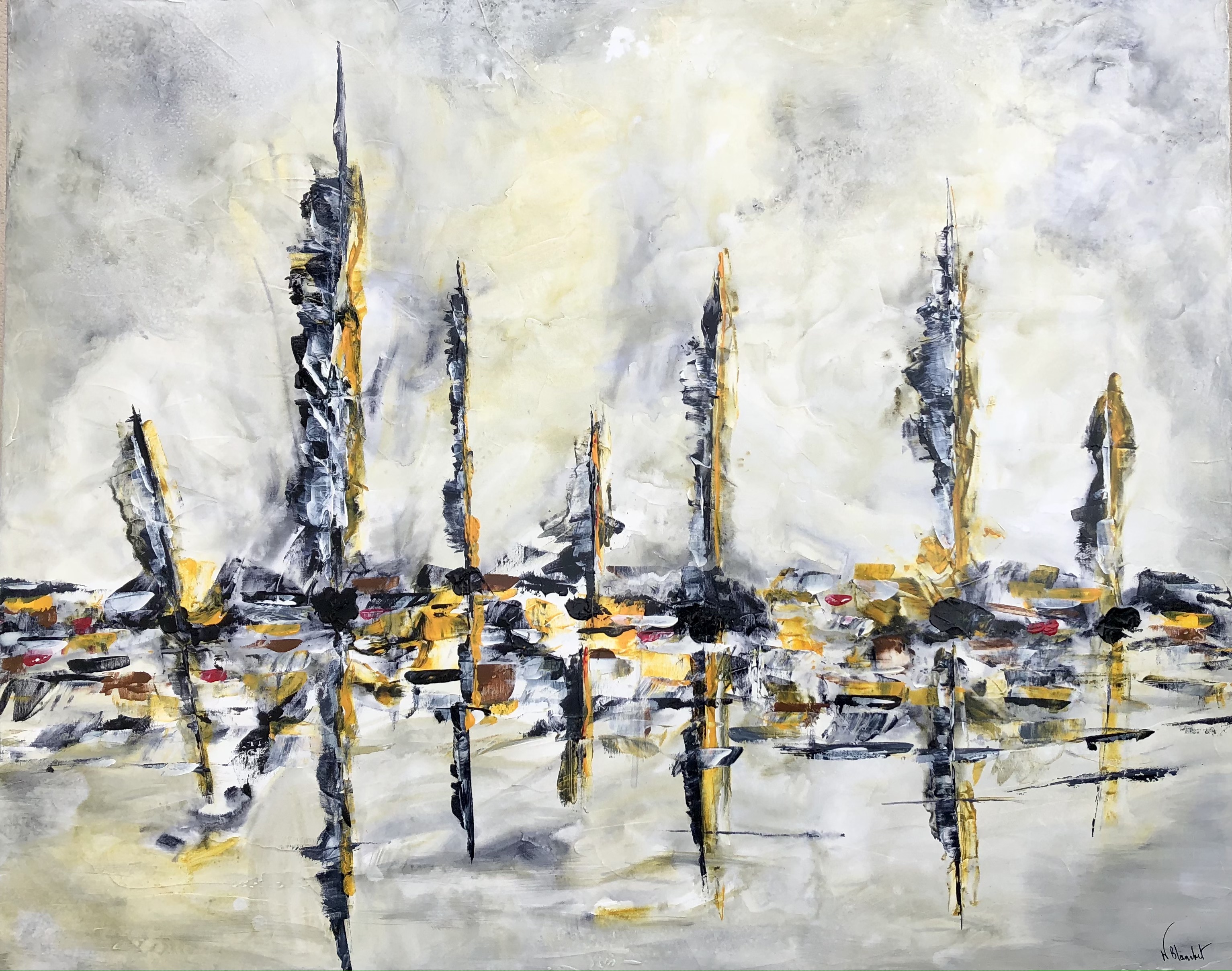 Technique mixte Atmosphère d'une régate avec un gros temps. Marine imaginaire représentant une ligne horizontale de voiliers qui vous laisse partir vers un univers, une atmosphère que vous seul créez. elle est basée sur la dynamique des couleurs, des verticales et de l'horizon. Cette oeuvre s'inspirent des mouvements des nuages, de la brume, de la mer et de l'écume .. La signature est au dos et sur la face. l'oeuvre est fournie avec un vernis protecteur. Belles dimensions .