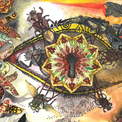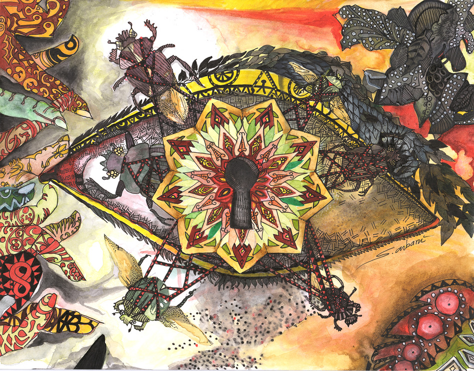 "un soupçon de magie" cette oeuvre est inspirée des couleurs de la nature. L'oeil est la clé du mystère, il capte les énergies et autres formes spirituelles qui tournoient dans son champ de vision.