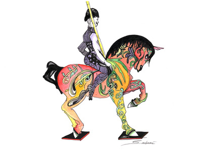 "Le cavalier" est une version fantaisiste d'un futur projet pour une oeuvre à l'encre de chine sur papier. L'aspect décoratif du cheval et du cavalier et des couleurs utilisées apporte un rendu unique à cette oeuvre.
