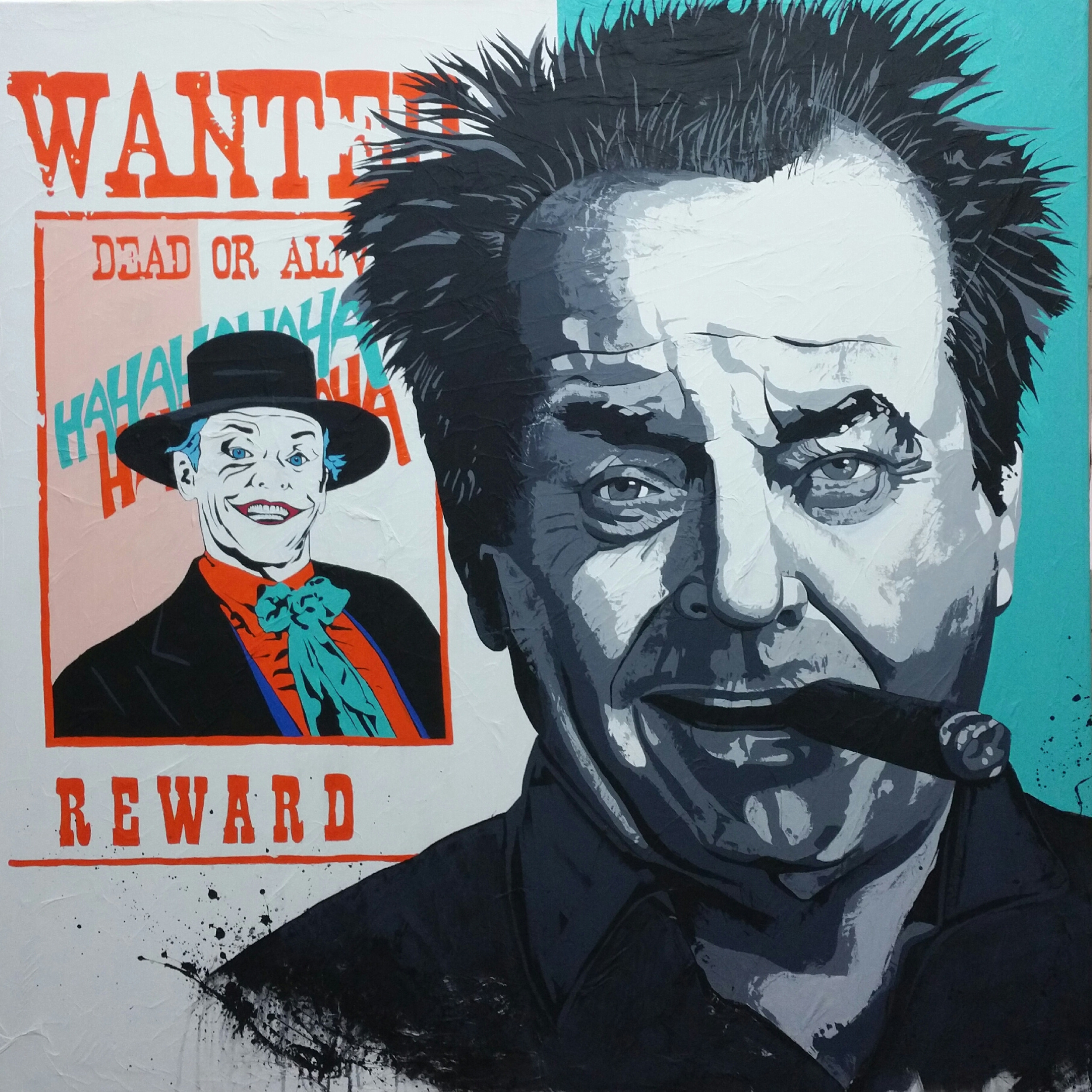 JACK NICOLSON, ICÔNE DANS LE CINEMA, SE DISTINGUE DANS LE CHOIX DE SES RÔLES.IL INCARNE À LA PERFECTION LE RÔLE DU JOCKER DANS BATMAN. CETTE PEINTURE EST UN HOMMAGE À UN GRAND ACTEUR QUI CREVE LES ECRANS DU CINEMA DEPUIS PLUS DE QUARANTE ANS. LE PEINTRE FRANCOIS POULAT MET EN SCENE JACK NICOLSON LE CIGARE AUX LEVRES, SATISFAIT DE POSER DEVANT UNE AFFICHE WANTED JOCKER . CETTE PEINTURE EST DE STYLE BD POPART.