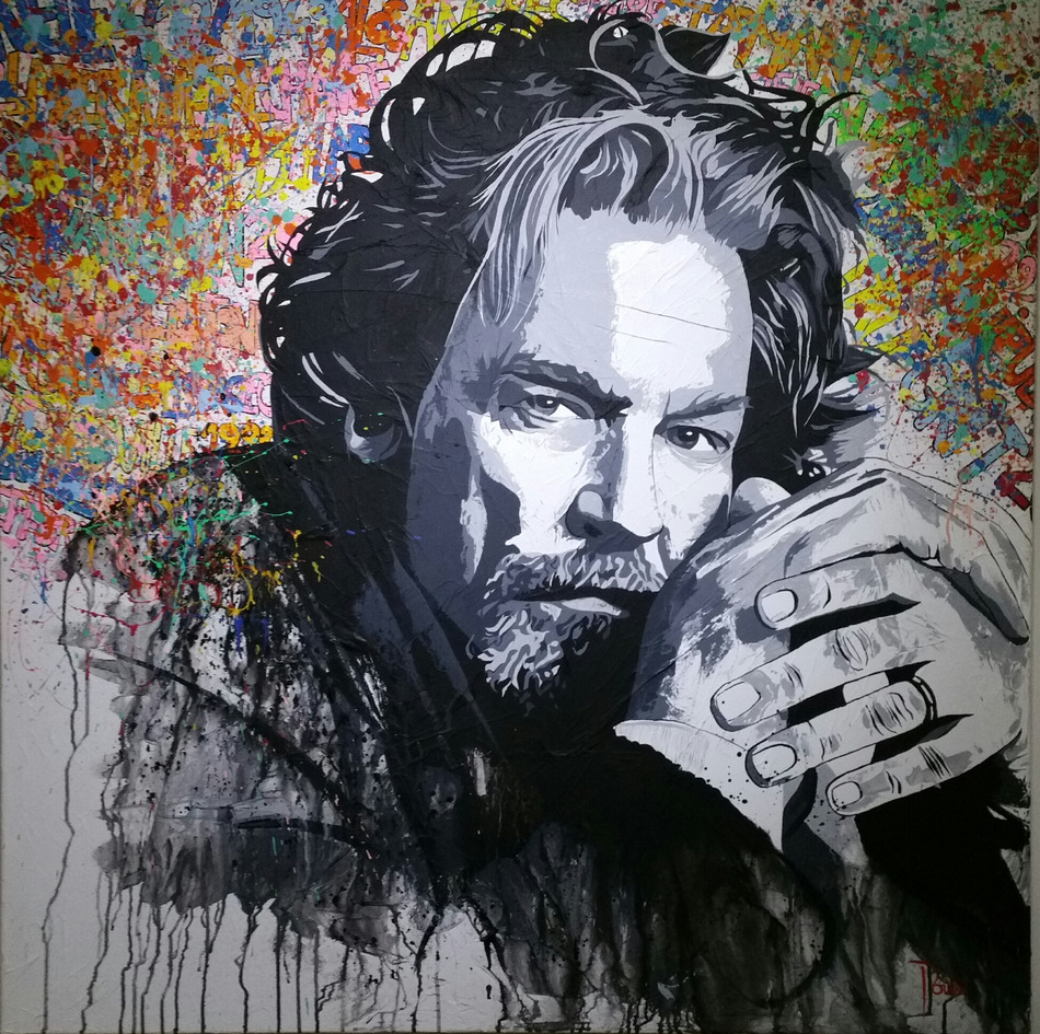 L'opposition du portrait tout en gris, noir et blanc et du fond coloré popart met en valeur l'hommage de ce comédien/ metteur en scène . Le peintre graffe les événements importants de la vie de Jeff Bridges (naissance, filmographie ....) en lettres de couleurs qu'il recouvre de projections augmentant ainsi la profondeur du tableau et ajoutant du mouvement à l'ensemble de la composition