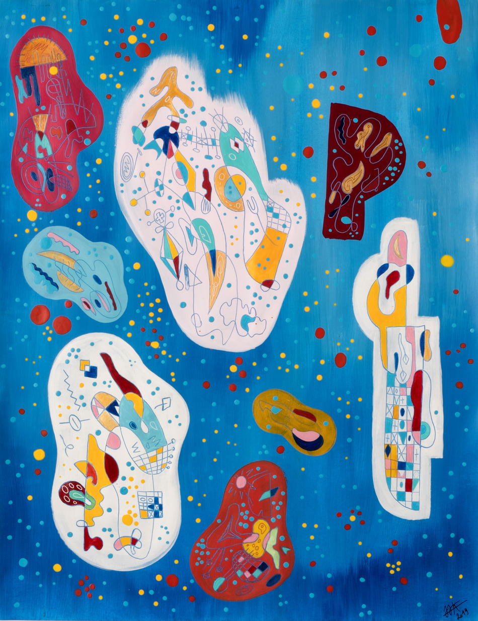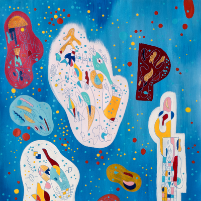 Oeuvre abstraite contemporaine. Peinture spirituelle. D'inspiration akashique ou cosmique, cette peinture à la forte dominante en bleus est composé de zones d'informations où des dessins, des grilles et des glyphes sont grattés et peints et de zones "vides" où de nombreux points sont déposés. La série Akasha parle de la connexion à l'univers dont nos âmes sont capables. Des informations quelles sont capables de puiser dans ce champ. Aussi bien en termes de guérison, d'inspiration que de connaissances.