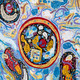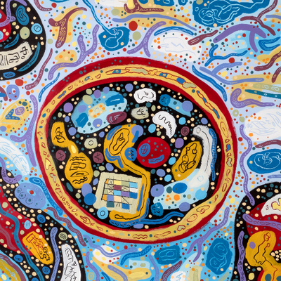 Peinture acrylique sur papier 200g format raisin horizontal 65x50. Couleur dominante : bleu clair. Autre couleurs: blanc, rouge, orange, violet et turquoise etc...Œuvre spirituelle, shamanique/chamanique et abstraite qui fait référence à la conscience, à la naissance, à la guérison et au rêve. Formes de couleur et pointillisme. Symboles et grilles grattées dans la peinture in prima.