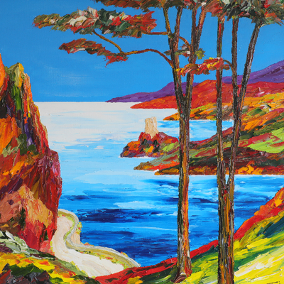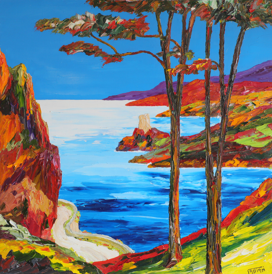 Bien installé au sommet de la falaise, l’artiste contemple le bleu de la mer jusqu’au vertige et aucune envie de faire cesser cette étrange sensation, mais au contraire la savourer jusqu’à l’ivresse, un besoin insondable. Toutes ces émotions que la toile messagère vous invite pour les partager, à le rejoindre dans ses rêveries les plus folles
