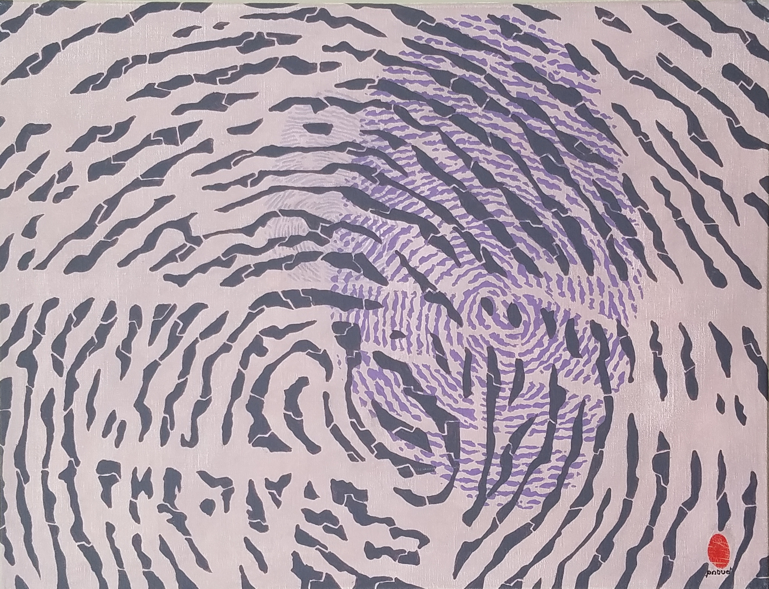 On peut voir sur ce tableau mon empreinte de pouce. Tout d'abord en gros plan, puis de plus en plus petites, donnant une impression de profondeur. Le sujet de ce tableau porte sur le besoin que j'ai parfois de m'analyser, pour comprendre qui je suis vraiment.