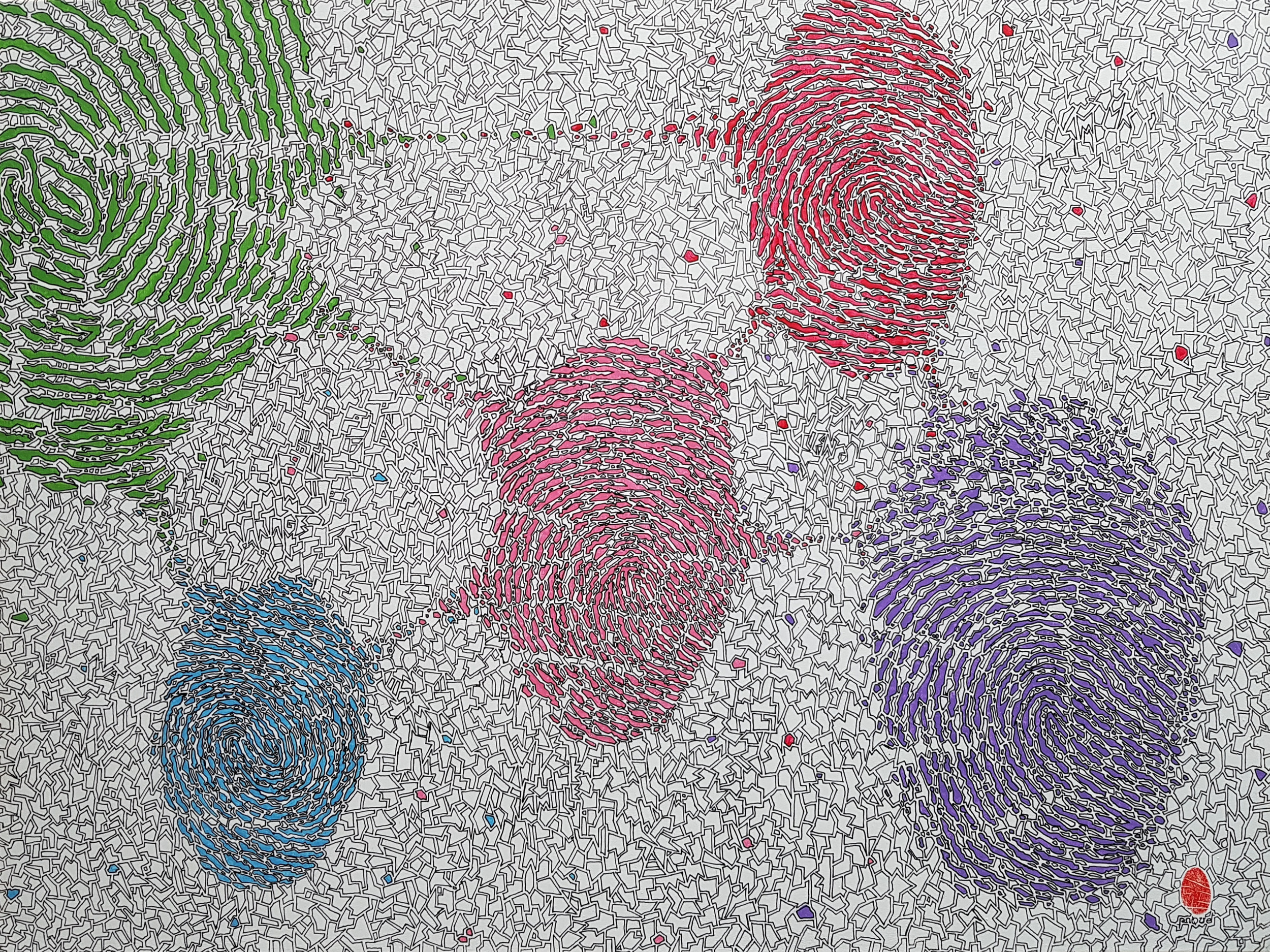 Ce tableau représente ma famille et les liens qui nous unissent. Les empreintes sont celle de mes enfants, de ma femme, ainsi que la mienne.