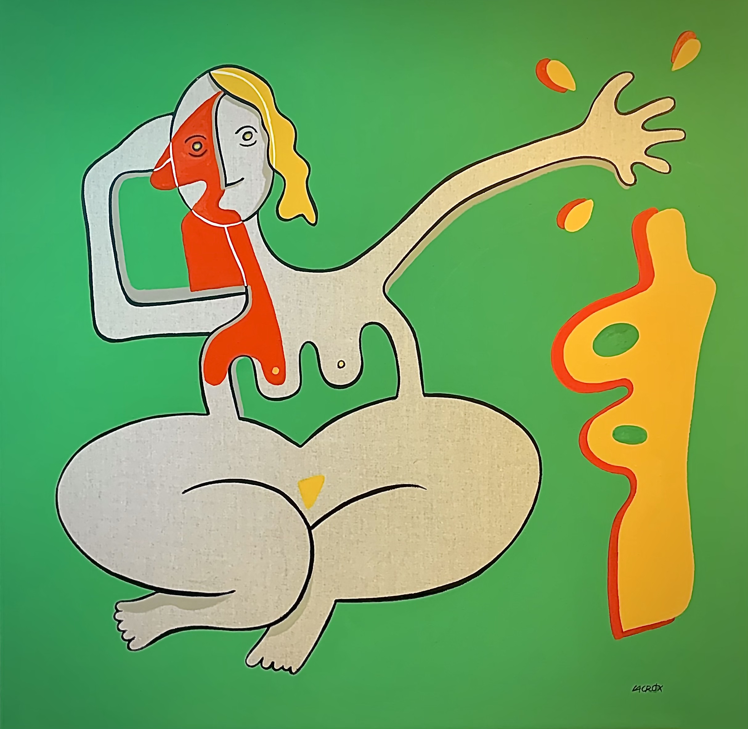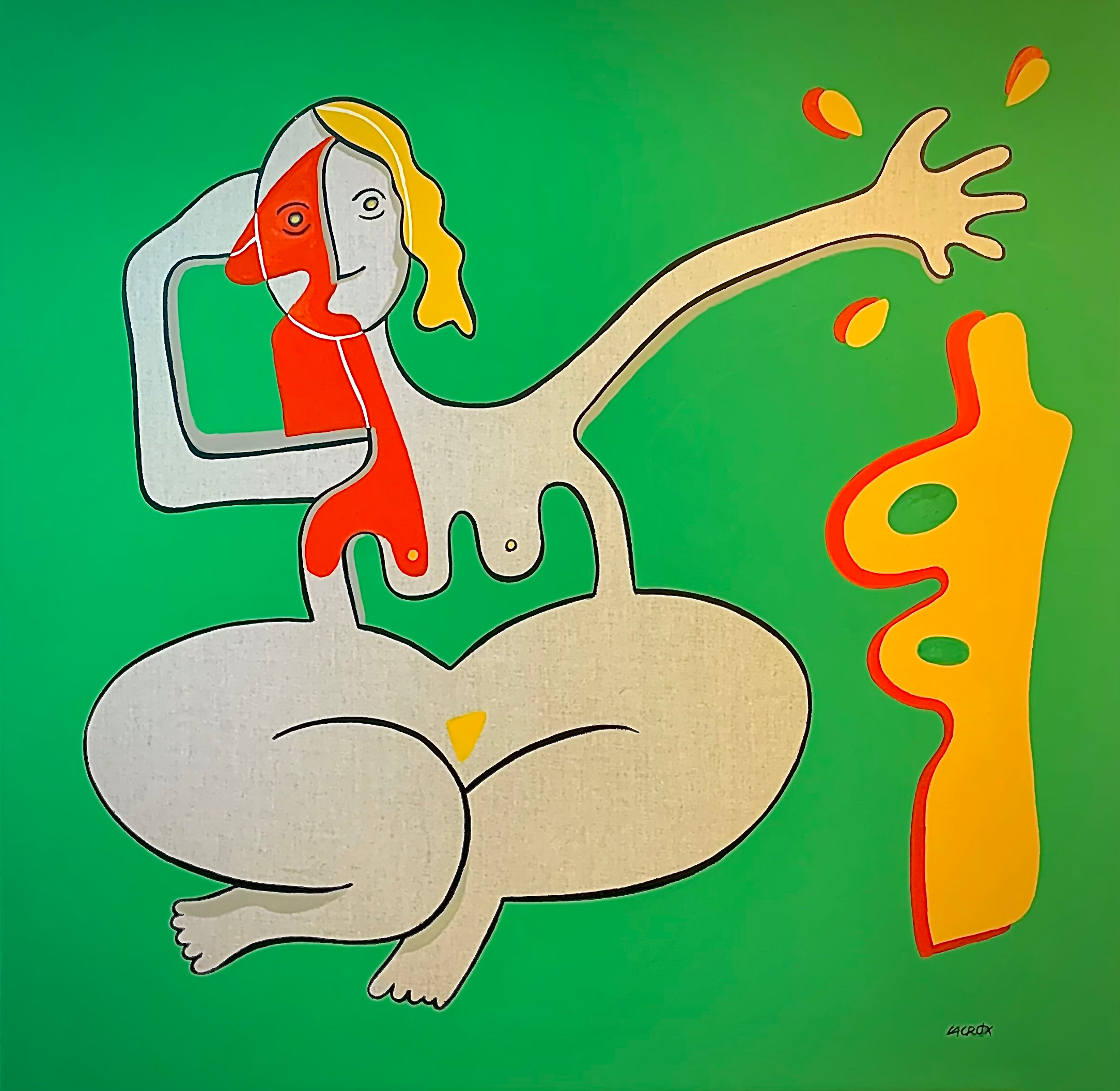 Traité comme une sculpture , mademoiselle jeanne s'expose avec grâce sur un fond vert