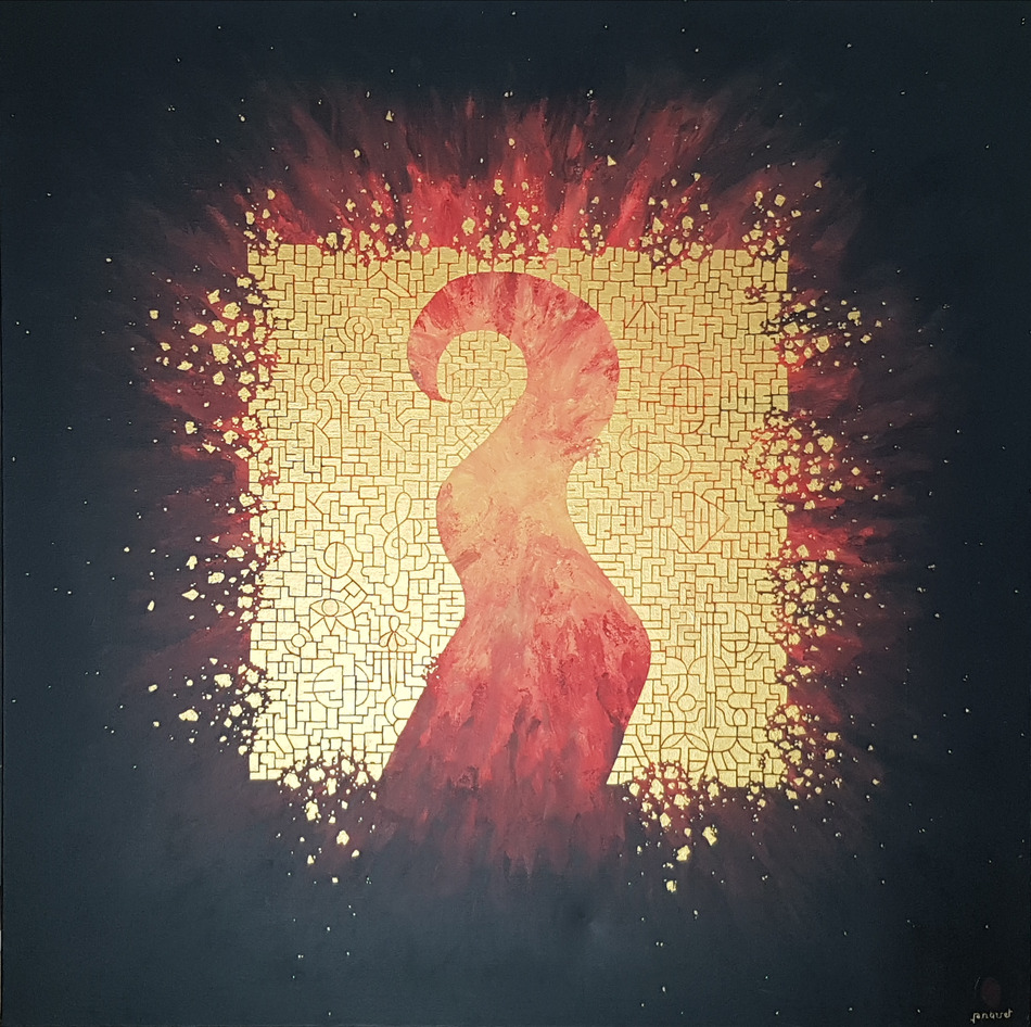 Vanitas 7/8 est le septième tableau d'une série de huit. Ce tableau est une vanité, un classique de l'Art que j'ai interprété avec mon propre vocabulaire artistique. Ici, je ne mets pas en cause l'Art (je suis mal placé pour le faire.), mais toute la spéculation, le snobisme qui l'entoure au détriment de la qualité artistique. On peut voir un carré qui représente le travail et la rigueur et qui donnent naissance en son sein à un chemin tortueux et incontrôlable.