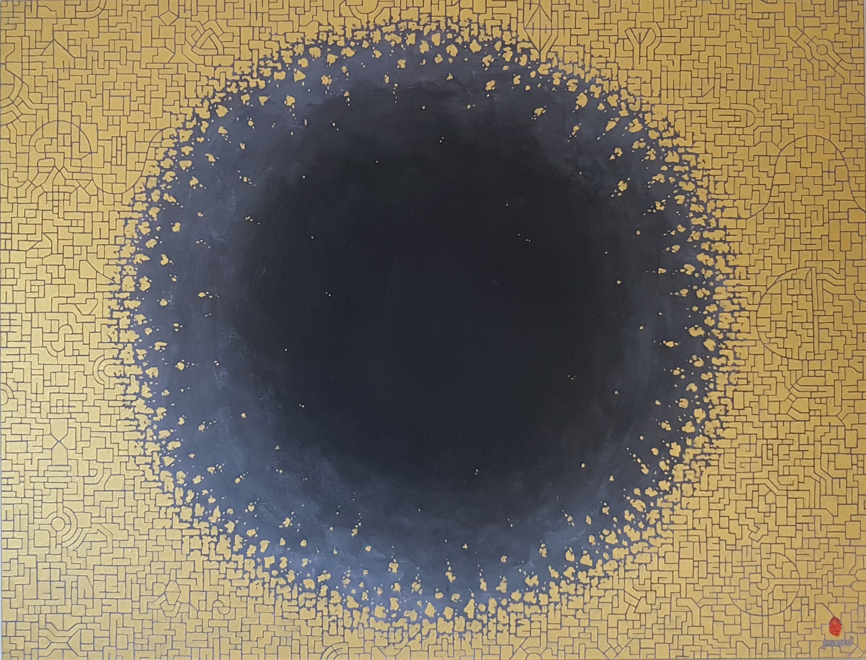 Vanitas 8/8 est le huitième tableau d'une série de huit. Ce tableau est une vanité, un classique de l'Art que j'ai interprété avec mon propre vocabulaire artistique. Ce tableau est une représentation allégorique de la mort qui emporte tout comme un trou noir sans que rien ni personne ne puisse lui échapper. Et qui met en avant la fragilité et la durée éphémère de la vie.