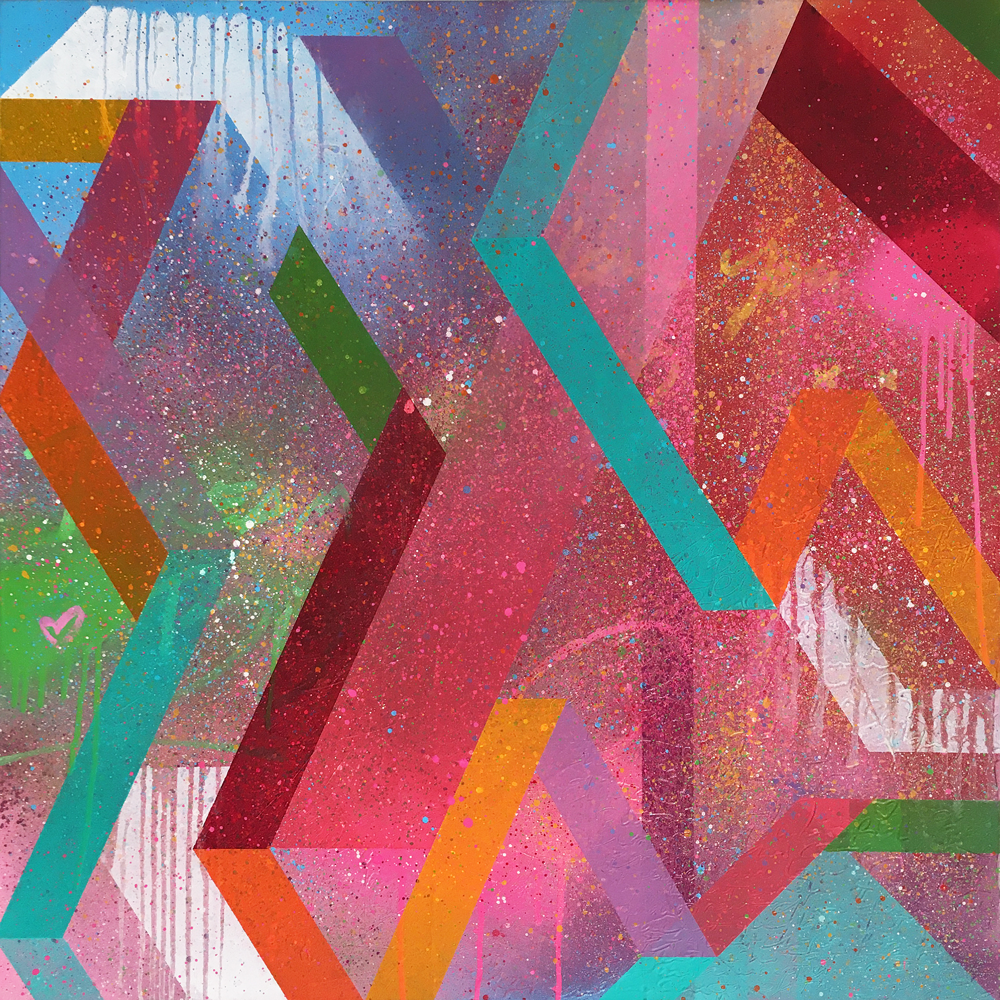 Dream est la première peinture d’un nouveau style inspiré du Streetart et du graffiti. Son titre reprend une des inscriptions qui la couvre, à peine visible… d’autres phrases ont disparues sous les couches de peinture. Toutes au service de la vie avec une autre inscription I love you évanescente. Il y a tant choses à dénoncer alors je préfère motiver et célébrer! Les formes géométriques font le lien avec ma casquette de créatrice de motifs mais c’est également symbolique. Ils représentent nos tranches de vie, une trame géométrique comme les évènements et nos choix constituent nos vie… à organiser et transcender sans cesse!