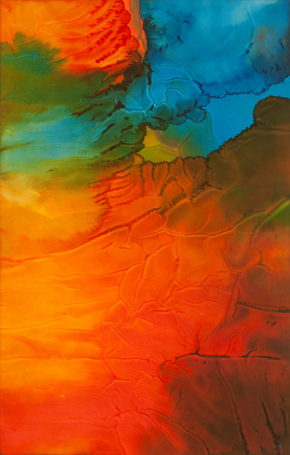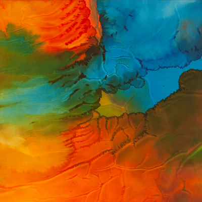 Comme dans le réel, en observant longuement les nuages…j’ai souhaité sentir et glisser sur leurs ailes de brume. Par couches successives fondre les unes dans les autres. J’ai donc poser un premier mélange de couleurs très fondu que j’ai séché jusqu’à un certain degré hygrométrique… pour qu’à la couche suivante plus dense en pigments créer des auréoles, des effets de flammèches. Un nuage glissant dans l’autre proches du soleil… celui-ci miroitant dans la vapeur d’eau. Là aussi c’est une invitation à flotter dans les airs, à glisser entre les mondes, s’élever.