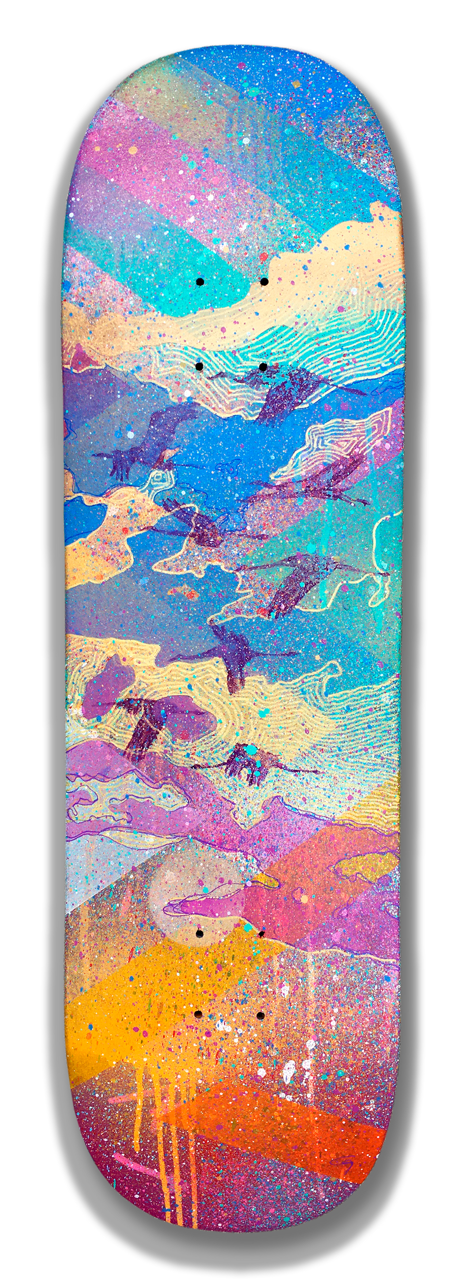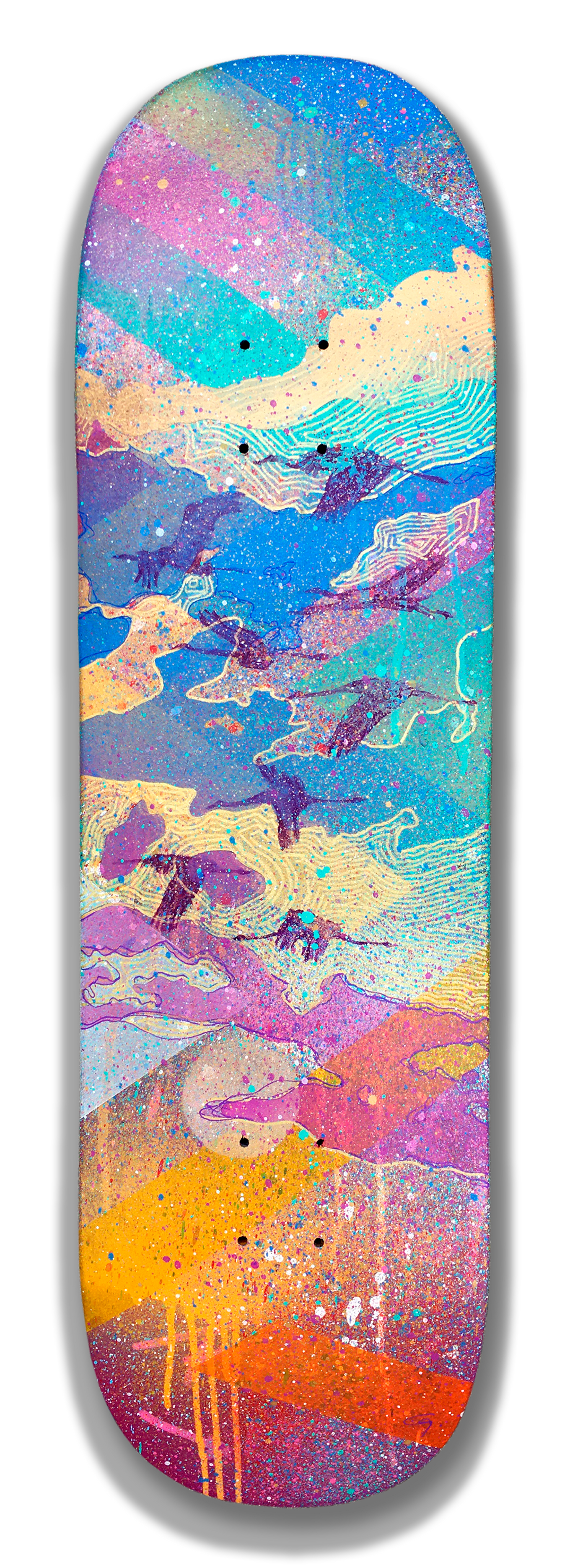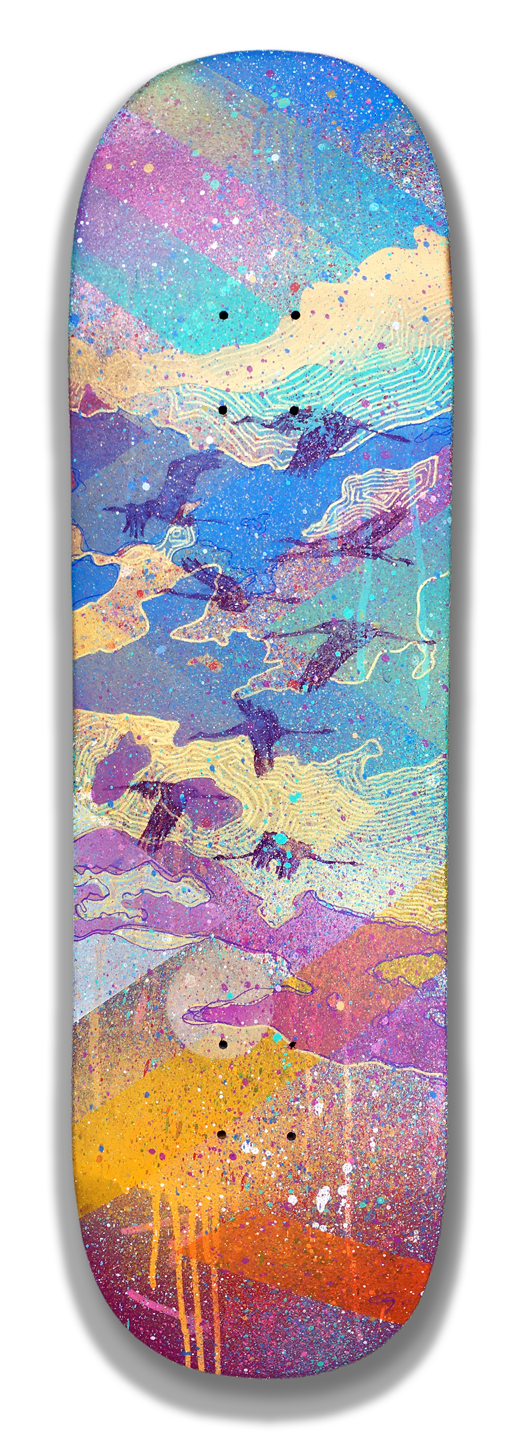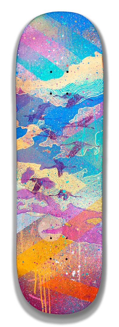 Envol, une autre expérimentation pour ce trio de boards avec un mélange de formes géométriques, des nuages réalisés au pochoir et au feutre Posca pour une atmosphère poétique. Le Skateboard est une invitation à la glisse et un sentiment de liberté… le vol de grues suggéré invite à un voyage plus aérien… à surfer le vent pour une expérience plus contemplative.
